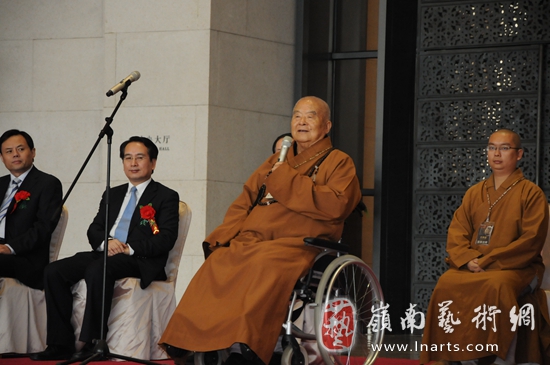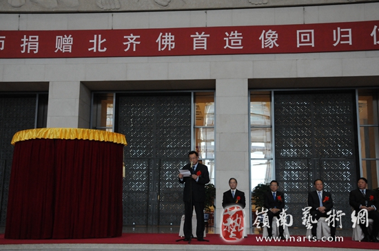 星云大师和文化部部长雒树刚、国家文物局局长刘玉珠为佛像回归仪式揭幕