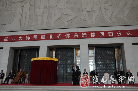 3月1日下午,国家博物馆大厅佛光映照、人声鼎沸,由国家文物局举办的“星云大师捐赠北齐佛首造像回归仪式”在北京国家博物馆隆重举行。佛光山星云大师,文化部部长雒树刚、中央台办主任张志军、国家文物局局长刘玉珠、国务院侨办副主任谭天星、国家宗教局副局长蒋坚永、国家博物馆馆长吕章申、中国佛教协会会长学诚法师、河北省副省长姜德果及两岸有关机构和人士出席文物回归仪式。
