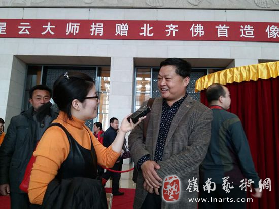 中国佛学书画院秘书长黄福军在佛像捐赠仪式上接受媒体采访