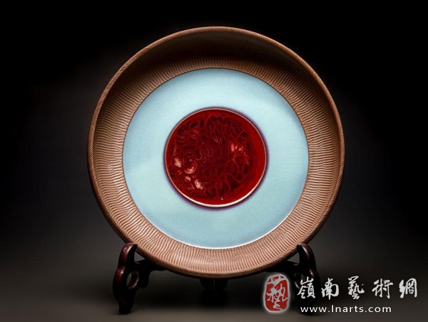 《日月同辉》之于李胜强,意义非凡,堪称其艺术历程中首件钧瓷艺术语言的代表作。细察这件作品,器形是传统的盘,手拉坯制成,盘的中心分施两种釉色,最中心的炽热的红色代表“日”,其龟背纹更是添了几分神韵,与外围的月白色的“月”交相辉映。盘子的边缘处全部采用均匀而有律动感的跳刀纹,寓意光芒四射。整件作品匠心独运,构思奇特,而技法精湛。