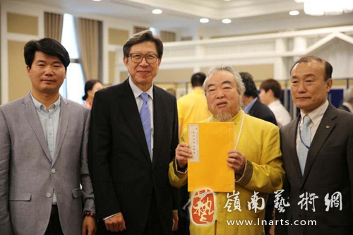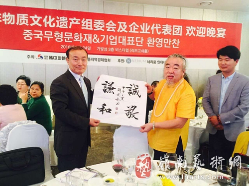 炎黄书画家协会主席闫锐敏向韩中地域经济协会会长李相基赠送书法作品