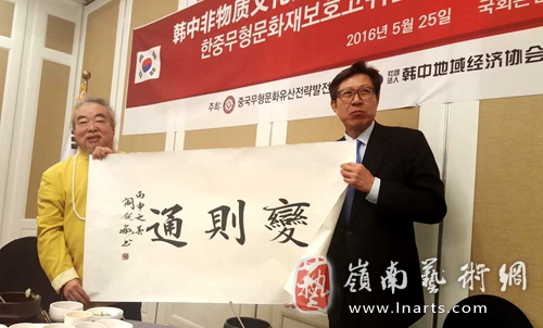 2016年5月24日上午,由文化部、中国文化产业智库研究中心支持;大韩民国国会、中国非遗资源管理评价研究委员会、中国非物质文化遗战略发展联盟联合主办;中华炎黄文化研究会砚文化联合会、炎黄书画家协会协办的中韩非物质文化遗产高峰论坛在首尔韩国国会举行。著名书法教育家、炎黄书画家协会主席闫锐敏应邀出席高峰论坛暨逸品神工艺术精品展,并被列席逸品神工艺术精品展学术委员顾问,在韩中地域经济协会李相基会长与组委会秘书长黄中的陪同下,韩国国会秘书长兼总统办公室事务总长朴亨峻亲临论坛致欢迎辞,随后参观了闫锐敏先生的书法及新华出版社出版的书法精品小楷《道德经》卷。