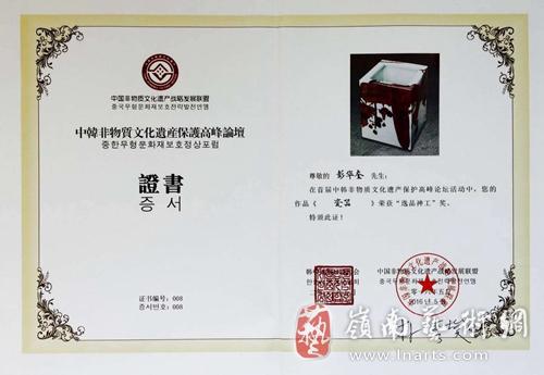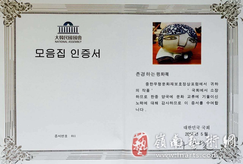 此次陶瓷艺术大师华奎书画及陶瓷艺术在在韩国国会展出期间。还作为中韩文化交流大使身份赠送韩国国会陶瓷作品,以展中国陶瓷艺术之魅力神韵;国会秘书长朴亨峻为华奎颁发了由本人亲笔签名的大韩民国国会收藏证书。经过中韩非遗高峰论坛组委会艺术评价专家委员会综合评价,华奎参展陶瓷作品《勤劳智慧中国娃》、《书法对联》作品分别荣获中韩非物质文化遗产保护高峰论坛暨逸品神工艺术精品展最高奖项:逸品神工奖和匠心传承•特别贡献奖”。此外著名陶瓷艺术家,世界儿童艺术馆馆长华奎还代表中国非遗传承人出席第十一届济州论坛中日韩企业家论坛及相关分论坛进行艺术交流活动,得到了业界人士称赞及出席济州论坛的部分国际政要的接见与赞赏。其天工人工合一并兼具大国工匠精神的陶瓷艺术展示了中国陶瓷工艺美术大师的自信及文化自觉!促进了中韩非物质文化遗产的交流对话与合作发展,对民族文化复兴时期的中华陶瓷艺术文化的普及和输出有着重要而深远的意义。