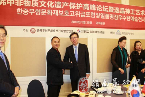 2016年5月24日上午,由文化部、中国文化产业智库研究中心支持;大韩民国国会、中国非遗资源管理评价研究委员会、中国非物质文化遗战略发展联盟联合主办;中华炎黄文化研究会砚文化联合会、中国非遗战略发展联盟玉专委协办的中韩非物质文化遗产高峰论坛在首尔韩国国会举行。著名砚雕家王安平应邀出席高峰论坛暨逸品神工艺术精品展,在韩中地域经济协会李相基会长与组委会秘书长黄中的陪同下,韩国国会秘书长兼总统办公室事务总长朴亨峻亲临论坛致欢迎辞,随后参观了王安平大师代表中国非遗传承人现场展示端砚制作技艺。