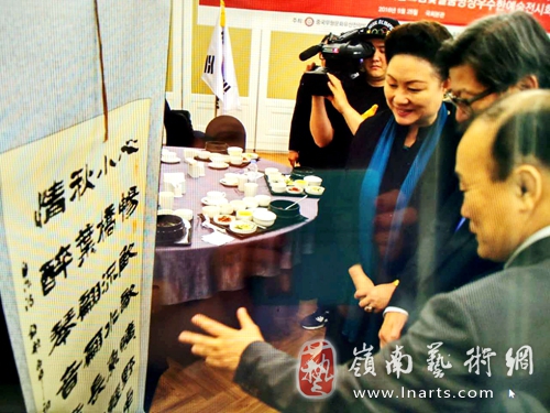 迟静杰向韩国国会秘书长朴亨埈和韩中地域经济协会的会长李相基介绍自己的书法作品