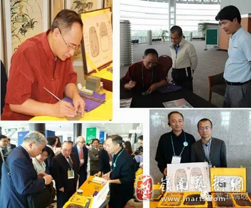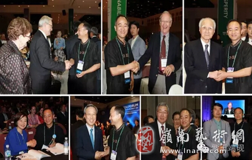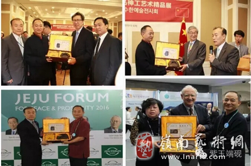 王安平以中韩文化交流大使身份分别将他的《平安竹》砚、《踏雪寻梅》砚、《平安龙》砚和现场制作的作品赠送给参会的各国政要。