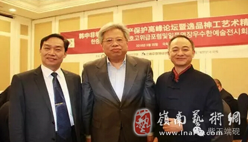 韩国国会秘书长兼总统办公室事务总长朴亨峻对中国非物质文化遗产的保护与发展给予了充分的肯定和赞扬,在中国非物质文化遗产战略发展联盟秘书长华庆、副秘书长黄中、韩中地域经济协会会长李相基的陪同下,亲临论坛现场并致欢迎辞,随后参观了每一位非遗传承人的作品,并热情招待了中国非遗代表团。在中韩非遗高峰论坛上,中韩双方代表就非物质文化遗产的保护和推进工作进行了深入探讨。文化部中国艺术产业研究院副院长西沐做了主旨发言。