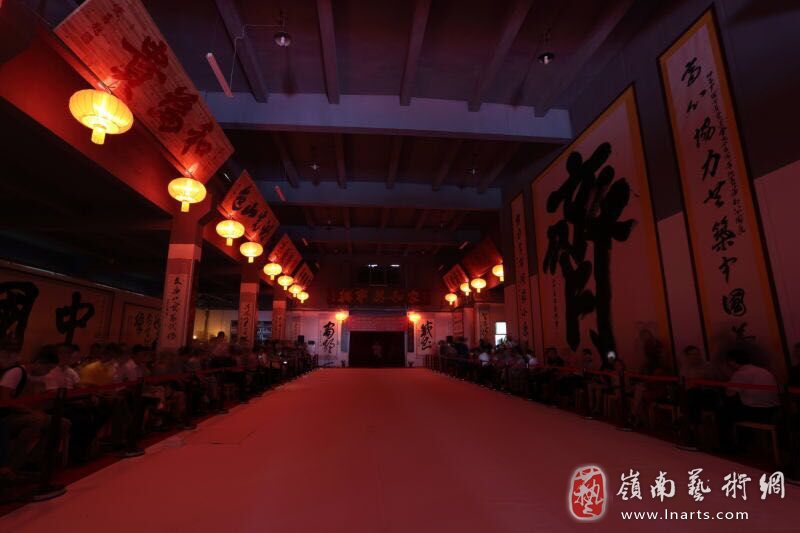 活动开始前半小时,展厅内采用烛光照明,并伴有琴、棋、书、画,闻香、品茗等表演,表演者身着中国传统服装,让参观者仿佛穿越时空,回归魏晋。开幕式宣布开始时,灯光骤然亮起,参观者仿佛置身于榜书艺术的神圣殿堂。四壁上的巨幅榜书作品“中国梦”、“福禄寿喜”浑厚大气,气韵生动。展厅中央悬挂的6.9米*4.3米硕大“齐”字更是大气磅礴,酣畅淋漓,大有五岳飞来动乾坤之势。高悬空中的大型木质匾额长廊古朴、典雅,让人耳目一新,宛如置身于老上海古街一般。徐双喜先生此次书写匾额时使用的笋壳笔、布团陈列在现场,让人大开眼界。展厅内还陈列了徐双喜先生的代表作品《临怀素自叙帖》、《爱心育子》等长篇巨制。展厅内精心摆放的兰花、瓷器、绍兴黄酒和大红灯笼,烘托出一种典雅高贵的艺术气氛,引起观众阵阵惊叹。