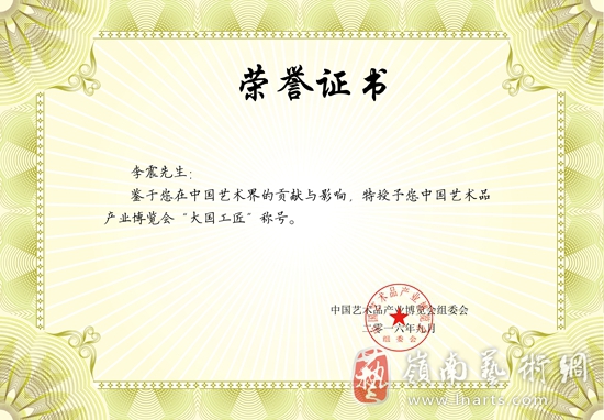 9月29日至10月5日,由文化部和北京市人民政府主办的2016中国艺术品产业博览会在首都北京隆重举办。文化部党组成员于群以及相关部门负责同志和北京市有关领导共同出席开幕仪式并致辞。著名青瓷艺术家李震被授予"大国工匠"荣誉称号。