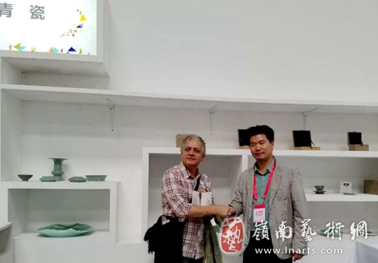 中国非遗资源管理评价研究委员会执行副主任黄中为国际友人介绍李震大师青瓷作品并合影