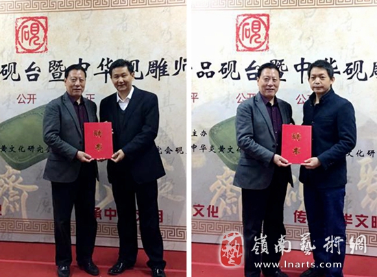 刘红军名誉会长为柳新祥(左)曹加勇(右)颁发第五届精品砚评选暨第三届中华砚雕师评选评委聘书