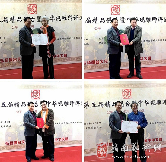 刘红军名誉会长为张淑芬(左上)刘克堂(右下)王祖伟(右上)王正光(左下)颁发第五届精品砚评选暨第三届中华砚雕师评选评委聘书