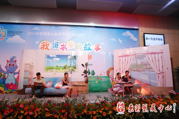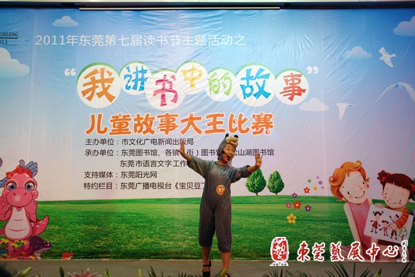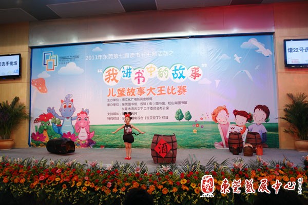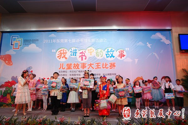 2011第七届东莞读书节主题活动之“我讲书中的故事”儿童故事大王比赛于6月4日至5日在市图书馆举行,来自全市各镇街的小选手们同场竞技,一争高下。由东城图书分馆选送的选手以稳定而出色的发挥,获得多项大奖。包括:红棉幼儿园的蔺晓夏获得低幼组特等奖、最佳指导奖,全市排名第一;花园小学的叶李诗获得小学组一等奖、优秀指导奖,全市排名第三;东城中心小学的张毳、李庆林老师和刘月婷、凌点点、徐泽桠三位学生组合的亲子组获亲子家庭组一等奖、优秀指导奖,全市排名第二。他们将代表东莞参加全省的故事大王比赛。