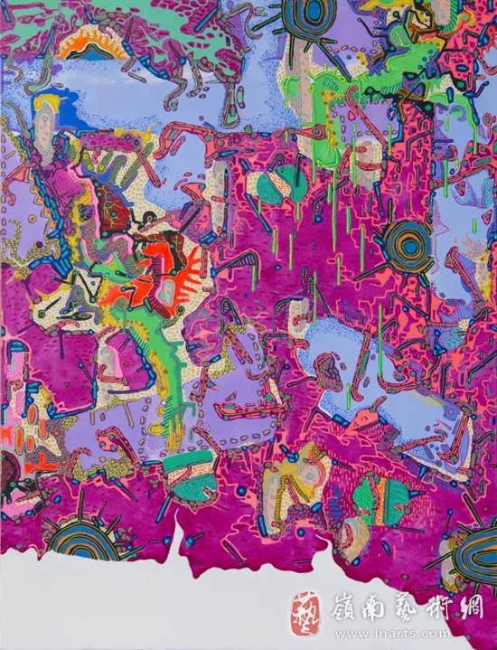 在《温室效应》中,艺术家回到地球和生命起源,想象宇宙大爆炸的高温环境,一切始于混沌。“有物混成,先天地生”,“吾不知其名,强字之曰:道。” 艺术家傅志刚用爆炸性的色彩呈现《道德经》的精髓,即世界就是一个混沌体。