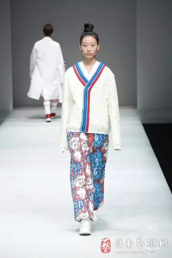 在艺术家的作品的使用上,设计师反对图案的大面积铺陈,而是提取其中识别性的图像,并用道家循环往复的思想进行设计后,搭配结合。在吴焕然看来,所有艺术都是破坏与重组的循环,时尚设计亦是如此。