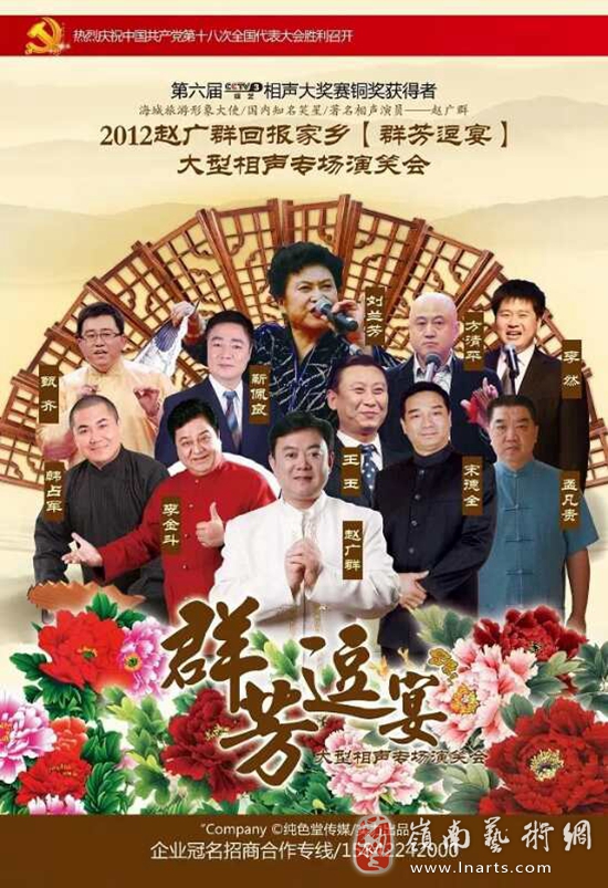 赵广群,著名相声演员,影视演员,歌手,主持人。师承著名相声表演艺术家煤矿文工团国家一级演员宋德全先生,是文哏大师苏文茂再传弟子。是中国曲艺家协会会员,中国电影家协会会员,中国民间文艺家协会会员,中国社会艺术协会理事,鞍山市电影电视艺术家协会副主席,辽宁省海城市曲艺家协会主席,旅游形象大使,辽宁省辽阳市艺术馆(国家一级馆)顾问,第十二届全国运动会火炬手,CCTV《星光大道》嘉宾评委。2012年12月举办“群芳逗宴”赵广群回报家乡相声专场演笑会名声大震。