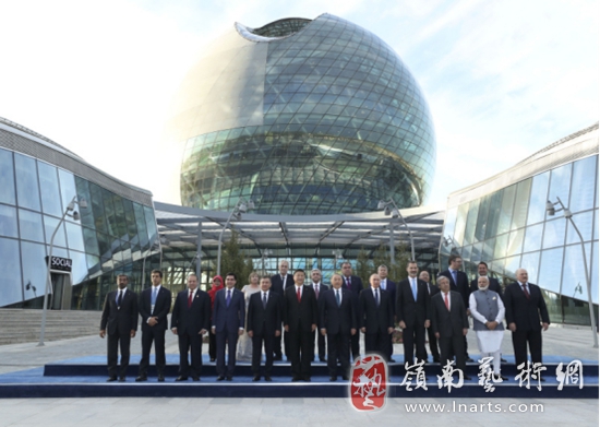 9日,习总书记应邀出席上海合作组织成员国元首理事会第十七次会议。阿斯塔纳世博会特设上合馆,于11日正式开馆。开馆仪式上,上合组织秘书长阿利莫夫和中国政府代表、中国贸促会副会长王锦珍,共同敲响了开馆鼓。并由中国政府代表王锦珍,将《紫韵东方.福临五洲》赠送给上合组织秘书长阿利莫夫。随着世博会的进行,《紫韵东方.福临五洲》将由中国馆官方陆续赠送参加世博会的一百多个国家和组织,作为中外文化交流的见证。