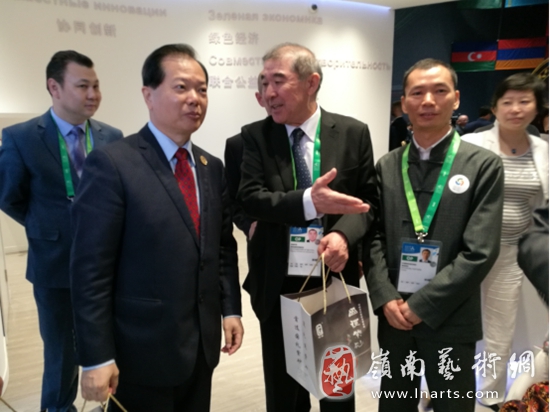 中国政府代表王锦珍将《紫韵东方·福临五洲》赠与上合组织秘书长阿利莫夫