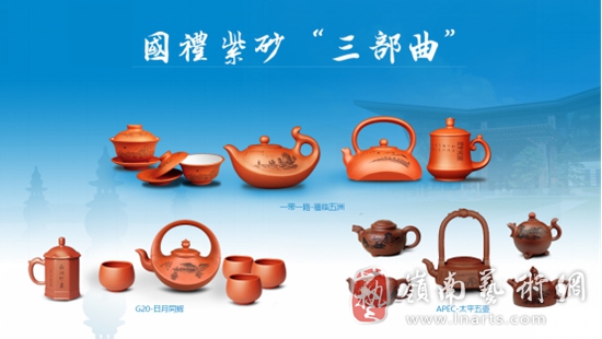 “物类之起,必有所始”。2005年东盟会议,中国紫砂艺术家汪成琼,被选为唯一的“国礼”指定创作人,其制作并镌刻的100多个品种的壶艺作品被选为“国礼”,分别用于赠送中外国家领导人和政要;2014年,汪成琼再次被选为北京APEC经济体领导人专用紫砂壶指定艺术家,31件紫砂壶作为国礼赠送给各国元首。APEC、G20、一带一路,汪成琼设计制作的紫砂三次蝉联峰会专用紫砂,被誉为“国礼紫砂三部曲”。
