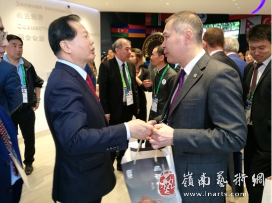 中国政府代表王锦珍将《紫韵东方·福临五洲》赠与哈萨克斯坦驻华大使努雷舍夫