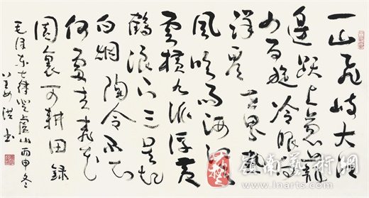 姜洪的书法作品从用笔用墨的酣饱,到笔势的鸾翔凤翥,再到整体的疏密得宜,计白当黑,都让旁人觉得颇为惊艳。姜洪认为,用笔在书写时线条的变化非常丰富,在文字逻辑表现意思的同时,线条的千变万化又造出了与文字内容相联而又独立的意境。“写字之人,要把自己的感受和心境通过用墨、书体、笔势、技巧、布白让读者有所感,甚至在心境上再创造。如果说,有追求,这就是我的追求。”
