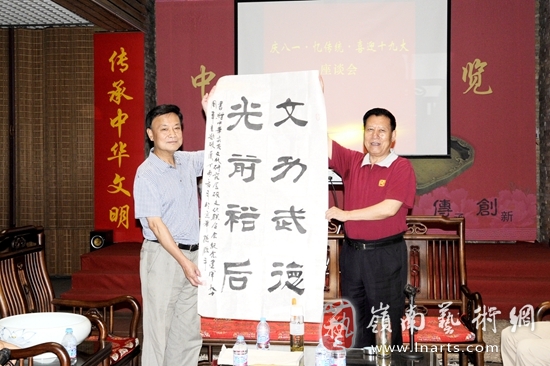 参观结束后,举行了“庆八一•忆传统•喜迎十九大座谈会”。孙临平、陈国源、张国兴、高玉家、金彤、张得一、侯建国、董永裁等分别发言,对中华砚文化的传承、创新与发展提出了意见和建议。刘红军会长作总结发言指出,在党中央、国务院关于大力弘扬中华优秀传统文化国策下,我们通过砚文化展览活动,宣传军魂、弘扬优秀的民族精神,这就是我们的文化担当和政治担当,这也是我们的情怀。我们对人民英雄、革命军人充满感情,我们对革命事迹充满敬意,我们对传承优秀的传统文化充满期待。将继续推进学习贯彻习近平总书记系列重要讲话精神,紧密团结在以习近平同志为核心的党中央周围,铭记历史、不忘初心、继往开来、振兴中华。以优异成绩迎接党的十九大胜利召开。