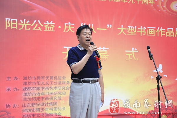 7月29日上午,由潍坊市拥军优属促进会、潍坊市阳光义工公益服务中心主办,鸢都军旅书画艺术研究会、潍坊市老年书画研究会、潍坊阳光书画研究院承办,山东新兴设计集团、潍坊市女书画家协会、潍坊市青少年书画协会、贵州习酒驻潍办事处协办的“纪念中国人民解放军建军九十周年 阳光公益·庆‘八一’大型书画作品展”在新兴(山东)设计集团一楼大厅隆重开幕。