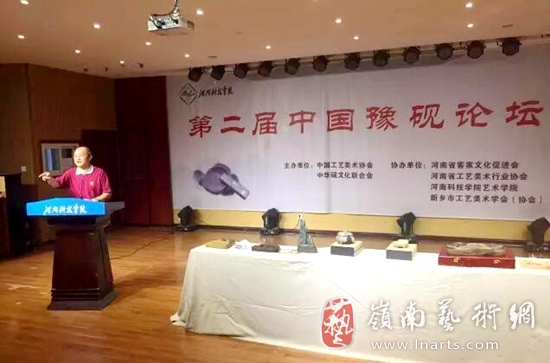 15日下午,“第二届中国豫砚论坛”在新乡市河南科技学院美术学院音乐厅隆重举行。中华炎黄文化研究会砚文化联合会、河南省工艺美术协会、河南科技学院、河南科技学院美术学院等单位领导,砚界专家、雕刻家,河南天坛盘石砚、虢州砚、澄泥砚、黄石砚、共砚等五大砚种传承人,制砚厂家代表及河南科技学院美术学院师生等约200余人参加论坛。
