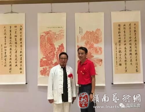中企资本书画院王行书院长与观展嘉宾在其硃砂山水画前留影,硃砂书画作品天然有禅静空灵,宁神静气之艺术特点,其构图严谨,手法生动,色彩鲜明,韵味悠长,极富传统文人画的意趣。