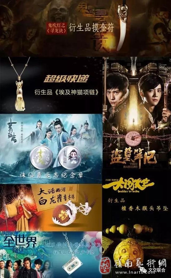 文交联合一直致力于影视衍生品的开发,并且挂牌了众多影视剧项目的衍生品,比如鬼吹灯之《寻龙诀》衍生品摸金符;《青云志》衍生品诛仙青云志纪念章;《盗墓笔记》衍生品九门铜钱;《大话西游3》白龙檀香木珠;《从你的全世界路过》衍生品自在之声卡坠;《大闹天竺》衍生品檀香猴头吊坠;《大唐荣耀》衍生品麒麟令等等。这些衍生品一经上线,也受到众多粉丝、影迷的喜爱和追捧,并屡破佳绩。