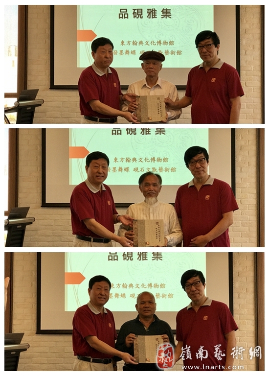 受刘红军名誉会长委托,东方翰典文化博物馆馆长、砚文化联合会副会长黄海涛先生向港台藏家介绍宣传了中华炎黄文化研究会砚文化联合会发展概况,并赠送联合会画册。东方翰典文化博物馆艺术总监张得一先生题写签名,向来宾赠送《中轴线•风雅颂》一书。