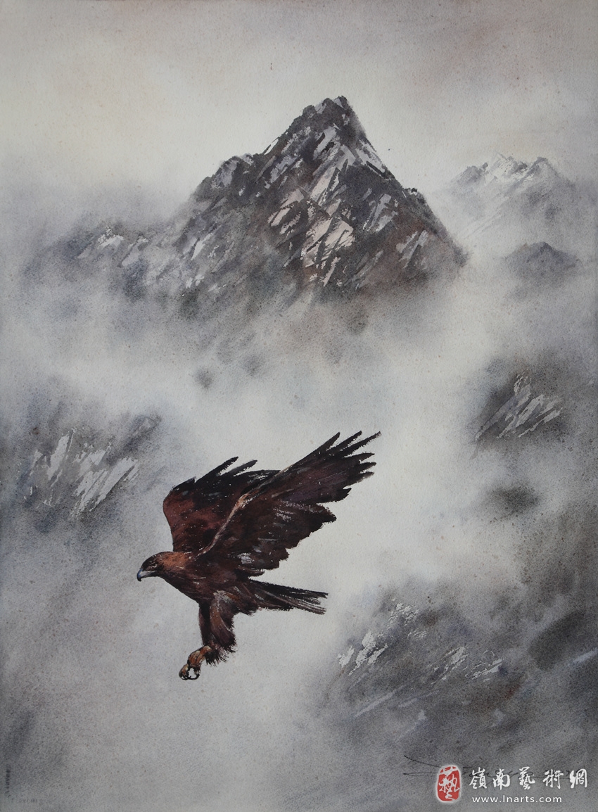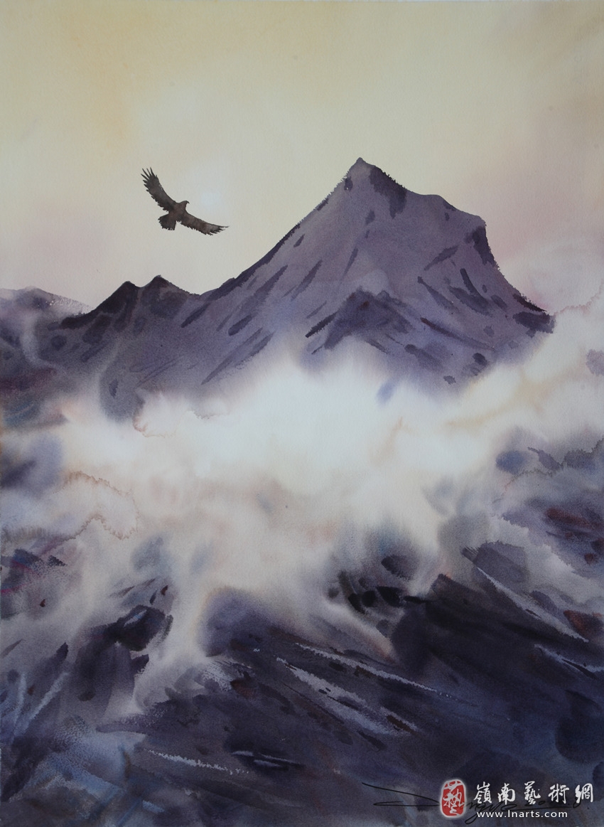 雄鹰展翅翱翔、盘旋于海湾、高山的上空,这是蒋烨教授水彩画中的场景。概括凝练的风景,气度非凡的飞鹰,一动一静间把融合中国传统文化的现代水彩语境表现得酣畅淋漓。在有限的画面中追求更多的文化意味是蒋教授的始终坚持。