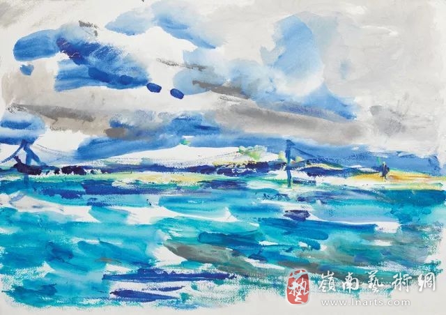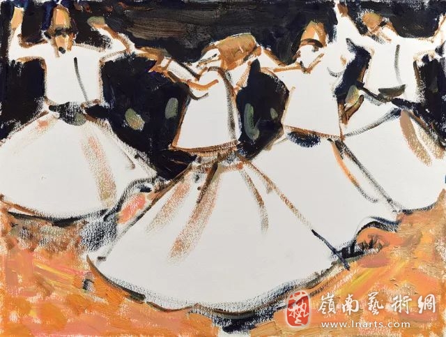 从南亚次大陆、中东与地中海沿岸跨越到中北美洲,不同的民族,不同的信仰,不同的人群带给石煜一样的陌生和不一样的新鲜,地域习俗有别,语言肤色有异,而当与当地的人或物近到能产生呼吸的共振时,才能把当地的文化心理状态表达进画面之中。每个民族都有属于本民族的圣节,清晨和夜半的恒河水畔是石煜的驻足点,同一条恒河寂静与喧闹,强烈的颜色反差,不断窜动的朝圣人群,在祭坛灯火交织下的倒影,宗教的神圣感与世俗的泥土气息,在光影变幻中的瓦拉纳西组画中酣畅的呈现出来。生命在此开始,由此结束,无论高贵与低贱,人世间的生与死会在这里同在,热闹激情的puja祭祀在石煜画面的呼吸中游弋着的一种高于生活的信仰之力。位于在亚洲的另一端土耳其是“丝绸之路”亚洲部分的终点,伊斯兰教和基督教文明在这里交流、渗透。土耳其转舞是梅弗拉纳创立的伊斯兰神秘主义教派的宗教舞蹈,他们认为万物都是旋转的,人从出生至去世,都是一个循环,都是一种旋转,通过旋转这种舞蹈形式与宇宙和神达成沟通和接触。石煜的描绘不是捕捉性的,而是采取了静帧式剪影,略去了对细节的刻画和环境的铺陈,而是通过浓烈的颜色关系烘托出肃穆的仪式感和剧场效果。与恒河祭祀的繁复的表现不同,这种连接神明或接引灵魂的舞蹈形式大道至简,大美自简。