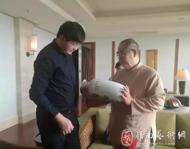 世屹文化董事长徐志鹏先生向 中国前外交官联谊会副会长 兼秘书长董津义先生 赠送 世屹文化「非物质文化遗产醴陵陶瓷代表作“吉祥富贵瓶”」