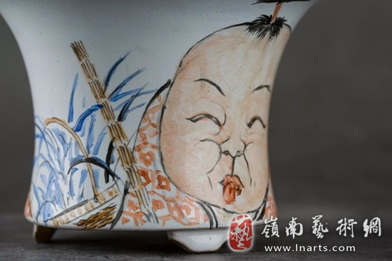 葛昊翔 吴浩 合作作品 月白釉翻口蒲盆 紫砂胎,天然南红玛瑙、天然绿松石入釉