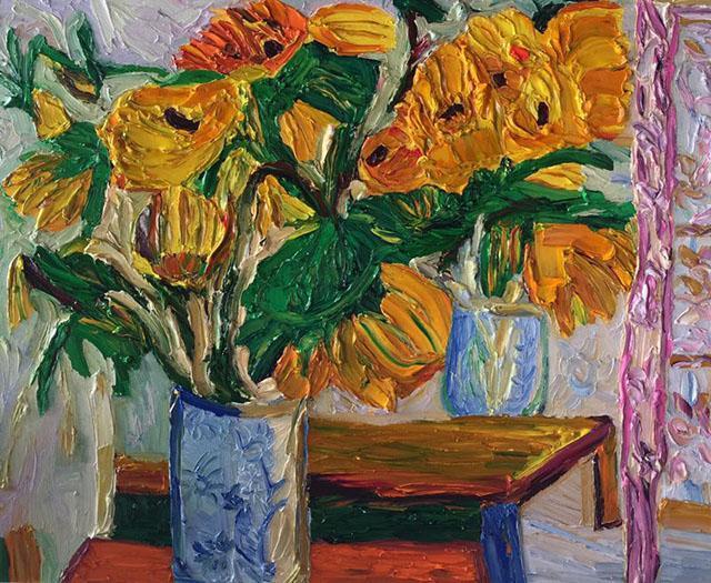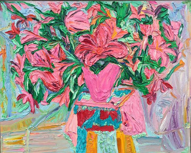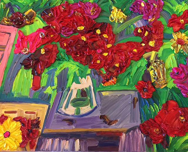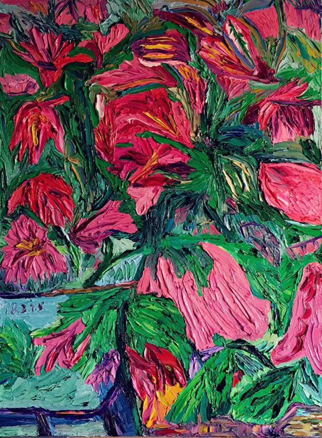 在绘画运用上,郭天馨打破传统的表达方式大胆有力;在创作内容上,她也有自己的独到之处,除了色彩艳丽的花景作品,她还擅长绘画人物、动物、风景,她有着超乎寻常的想像力。除了借鉴中外名家的大作题材,更多的是坚持自己的原创作品,每一幅原创作品都承载着对美好生活的向往、对美好情感的珍惜与回顾,她的每一幅作品不仅给人们视觉盛宴,更是给人以满满的正能量,赏心悦目的同时,激励人们向着更加美好的未来努力。