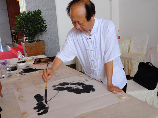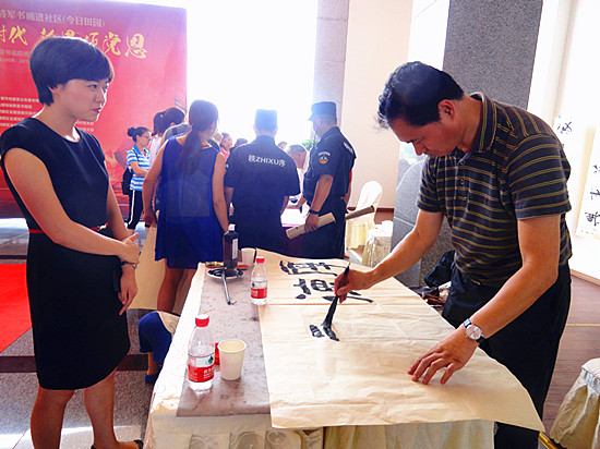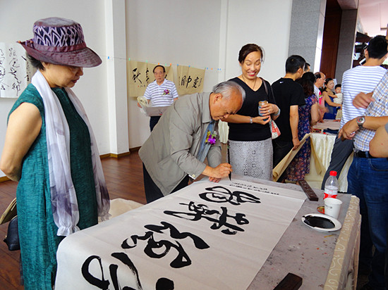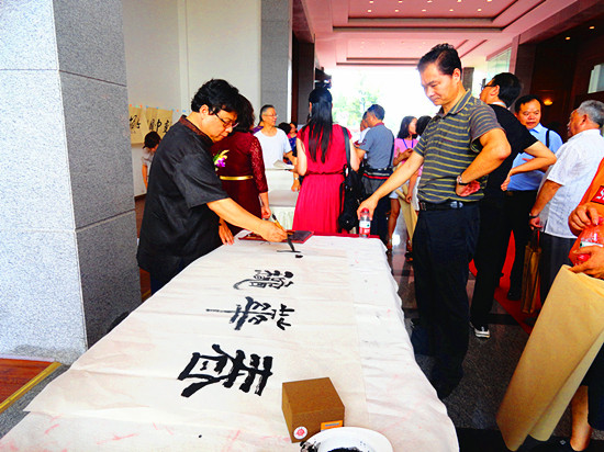 这边一曲刚罢,那边音乐声又起。在悠扬的古琴声中,飘逸的古装美女高超的茶艺表演赏心悦目——而此时,曾祥元教授在舞台上现场书写的一幅精美书法作品,也早已是一气呵成……