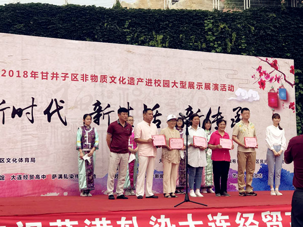 此次活动由大连市甘井子区文化体育局主办,甘井子区文化馆,大连经贸高中,萨满轧染传承基地、大连满族联谊会承办。该区有省级非遗项目一一大连老黄酒酿造技艺一项;市级非遗项目漆雕葫芦、民间传统面塑技艺、单弦牌子曲,辽南整骨术等七项;此次活动,区级非遗项目新增了剪纸(2个)、花饽饽制作、缝纫机绣技艺、螺旋翻子拳、古螳螂拳、秘宗拳(东北派)、瓷板画等八个项目。并现场为瓷板画“珠山八友"之一汪野亭的第四代传人于勇(老土)、缝纫机绣技艺传承人林涛等八个项目的传承人颁发了区级非物质文化遗产保护项目代表性传承人证书。
