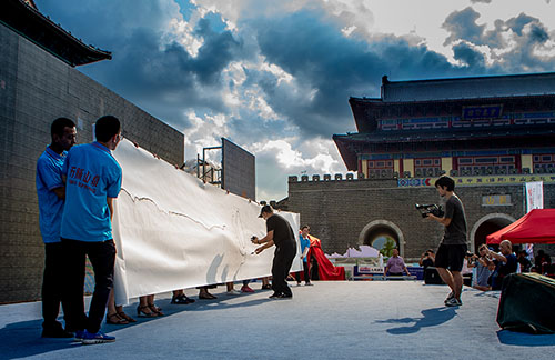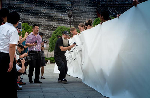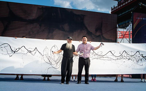 邵岩特别看重射墨的开放性与参与性,这也是传统书斋里书法的短板。“如果说,我的射墨是基于对书法"书写性”与“抽象表现性"创新的思考,然而在我操作“射墨”时,我创作实践的行为性又充分具备了大众游戏的特质。”