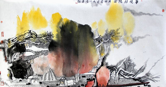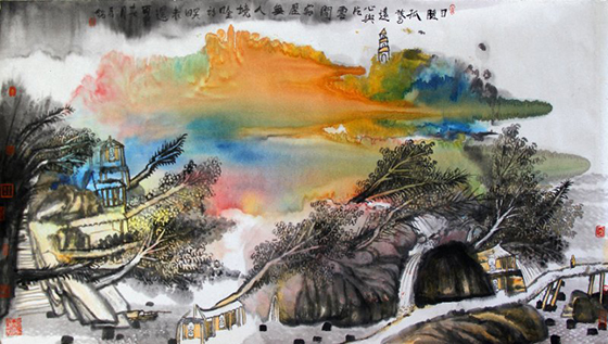 马铭老师四十多年笔耕不缀,故藏法内之功,亦取法外之韵,于法内法外创新自主,他的新中国画,是在继承唐代王洽的泼墨画法的基础上,揉入西欧绘画的色光关系,而发展出来的一种山水画笔墨技法。可贵之处,是技法的变化始终能保持中国画的传统特色,创造出一种半抽象墨彩交辉的意境。画风清新俊逸,瑰丽雄奇,气质淳化,笔简墨淡,与天地融合。画面诗文真率豪放,书法劲拔飘逸、外柔内刚、独具风采。
