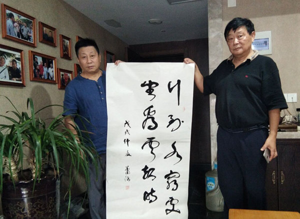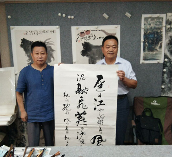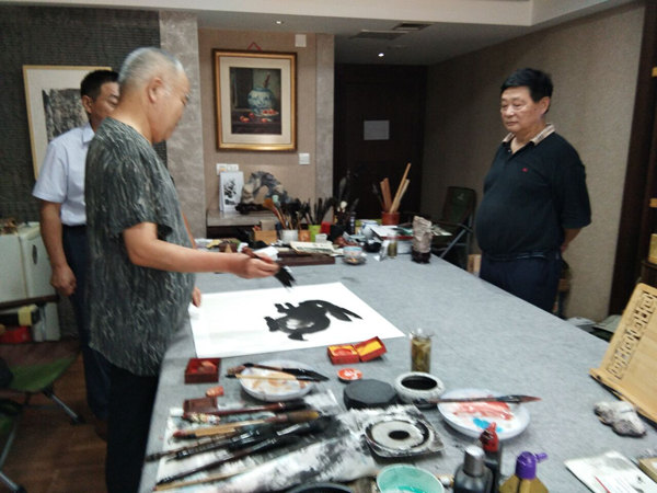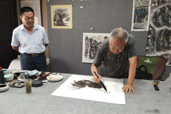 2018年7月19日下午,炎热的天气阻挡不了书画家交流的愿望。著名画家潘家忠、著名书法家权学友、著名书法家肖涵、书画推广人韩鸿飞等相约范晓芒工作室,欣赏范晓芒山水佳作,开展交流笔会,共话书画未来。