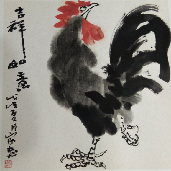 潘家忠的中国画大写意所创作的梅、兰、竹、菊、荷花、芭蕉、雄鸡、仙鹤、苍蝇、猫、狗、骆驼等,着笔简洁、墨色淋漓,给人一种朴实、浑厚、潇洒、脱俗的高于生活的艺术美感。潘家忠的指画人物,娴熟而恰到好处地运用指、墨效果,紧紧抓住人物的精、气、神描绘,令人观后称奇叫绝。纵观他的画作,可谓雅俗共赏,深得艺坛同仁和坊间百姓所喜爱。
