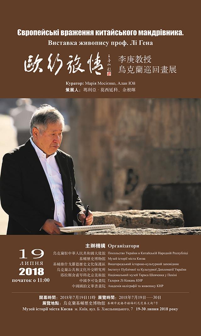 欧行旅情——李庚教授乌克兰巡回画展由乌克兰驻中华人民共和国大使馆、基辅历史博物馆、塔拉斯舍甫琴科北京美术馆、基辅维什戈罗德历史文化保护区、乌克兰公共和文化外交研究所、李可染画院、国韵文华书画院联合主办。展览持续至七月三十日为期十天。