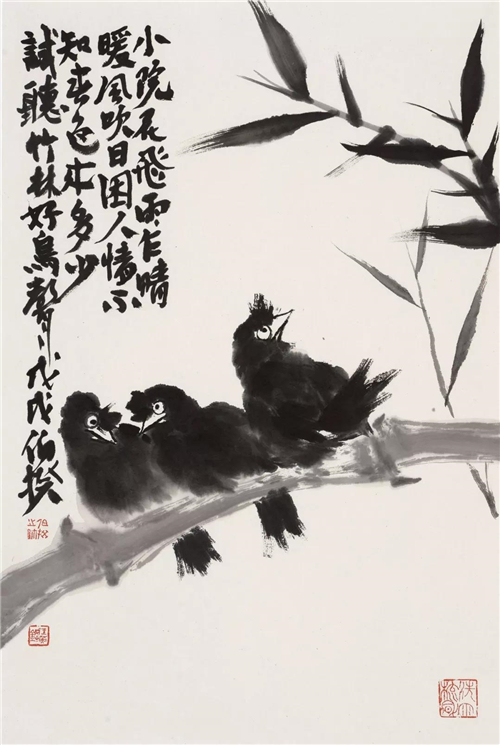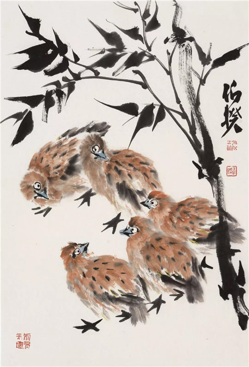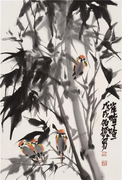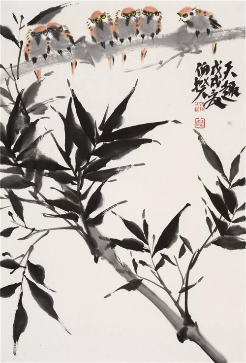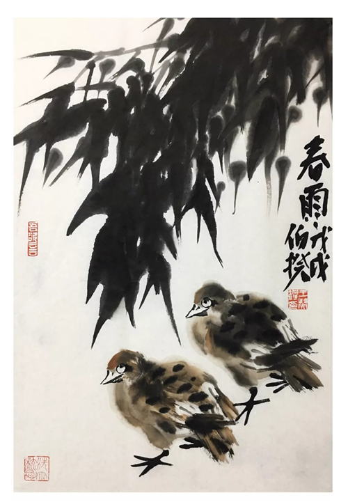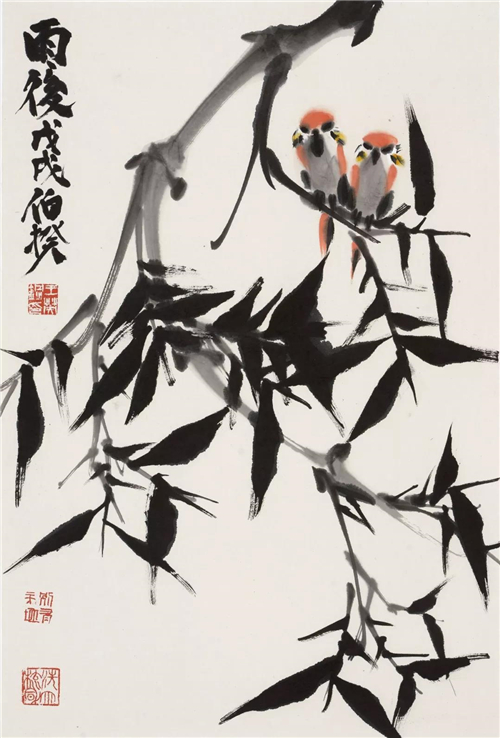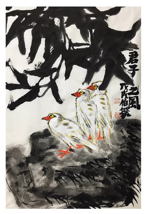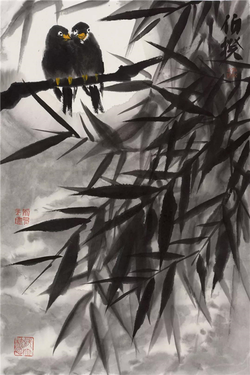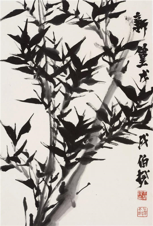 如果说郑板桥之写竹以“瘦”长,而伯揆之竹则以“肥”美。传统画竹大都以瘦长撇叶,“个”、“介”组合以取巧似。伯揆写竹则中侧锋并举,撇叶短而壮硕,行稳不躁,以“拙”出巧,构成独特,令人耳目一新。
