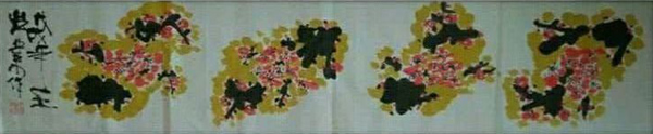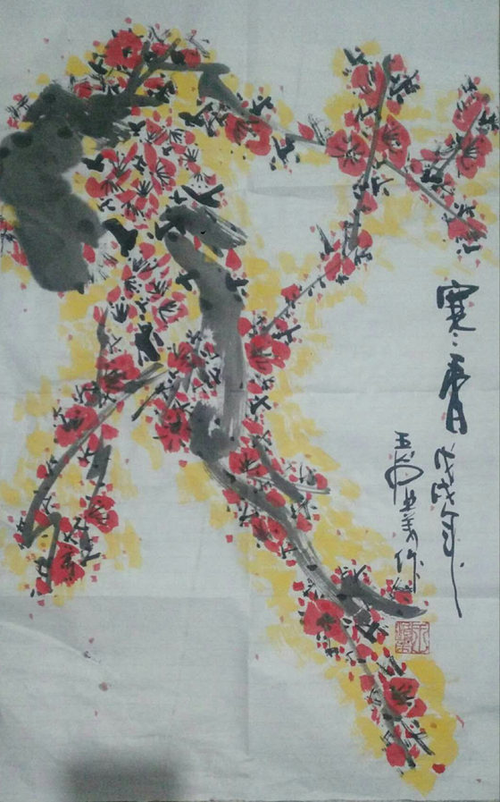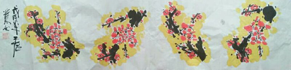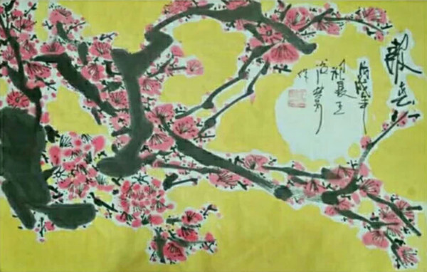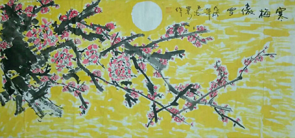 他还善用灵巧多变的笔墨,色墨结合,以色助墨、以墨显色,在传统固有色中融入西洋画法讲求的色彩规律,以求整体色彩对比协调,为画面增添韵律。能准确地把握动态中的梅花,并且能在情景交融中体现出转瞬即逝的情趣。因此他的梅花刻画细致入微,鲜活多姿,生动可爱,情趣盎然。摆脱了以往梅花的僵化程式,创造了清新灵妙,雅俗共赏的鲜明风格。