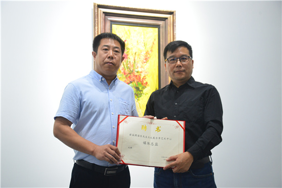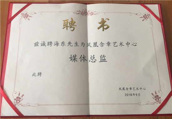 凤凰含章艺术中心与艺美视界网签署战略合作仪式后同时凤凰含章艺术中心聘请海东先生担任凤凰含章艺术中心媒体总监一职,凤凰含章艺术中心总经理于飞翔先生为海东先生颁发聘书