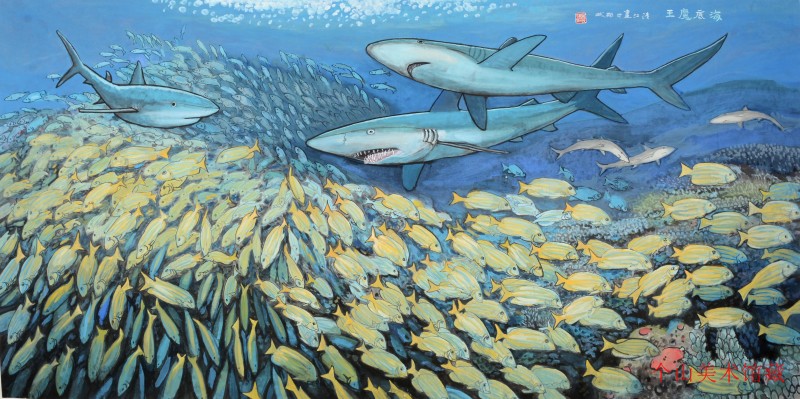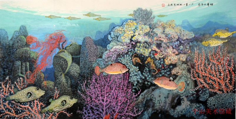 改革开放以后,随着全球经济一体化,中国经济腾飞,发展海洋经济成为全球发展的共识。海洋文化也随之兴起,与海洋相关的文化艺术门类不断扩大,中国美术界开始出现以海洋为主要创作题材的画家集群。这些画家立志描绘海洋、讴歌海洋,表现大海的壮美,博大精深。揭示海洋与人文、哲学、审美的关系,作品中西结合,风格各异,有的大浪磅礴,有的海境深远,创造了中国海洋绘画的艺术特色,也取得了非常大的艺术成果。我查过关于海洋绘画的资料发现,几乎所有的画家都在表现波涛、海岸等海上世界。唯有吴清江先生用笔墨同时表现了海上与海下世界。