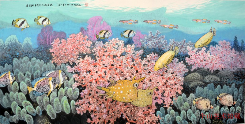 观吴清江先生作品,能够看出他对海洋的热爱与对艺术的执着,有着一种特别的认知与感受,他画海浪、沙滩、旭日、椰林、渔歌、潮起潮落,都充满了浓浓的情感。他笔下的海底世界更是让观者大饱眼福,他用谨细而意象的笔法重点刻画珊瑚、鱼群、海藻等物类,色彩艳丽,灵动多姿,富有变化,尤其对鱼有着细致而又生动的描绘,与有着粗旷之美的海上风光形成对比,更进一步突出了画面的效果与内涵。他的画一丝不苟,墨色交融,深暗自然之道,有传统功夫而无束缚,吸收了不少其它画种优秀的东西而又不失中国画的根本,敢于探索、走前人没有走过的路,呈现给人一种层次鲜明的3D视觉效果,这无疑是一种进步,这也形成了他独特的绘画风格与特色。由此可见,吴清江先生填补了中国海底绘画的空白。