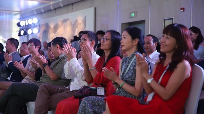 开幕盛典一开始,古琴泰斗、中央音乐学院教授李祥霆先生,用有着近一千三百年历史的盛唐名琴“九霄环佩”,为大家抚琴演奏,赢得四方宾朋一致赞誉。十名国学少年,身着汉服,齐诵古代经典《大学》,预示中华文化薪火相传,未来更加美好,将现场气氛推向高潮。