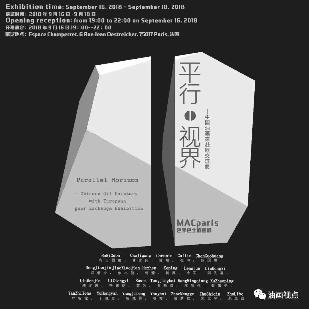 “平行·视界——中国油画家赴欧交流展”于法国时间2018年9月16日下午19:00,在巴黎巴士底画廊隆重开幕!本次展览由北京丹青引文化有限公司主办。由陈家祥先生主持策划。本次活动邀请了24位来自全国各地的优秀的油画艺术家,共展出50多幅优秀艺术作品,展览获得大家的一致好评。